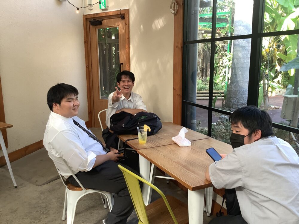 •本日は生徒たちが1番楽しみにしていたであろうタクシー研修に出かけました。班ごとに事前に計画したプランに沿って思い思いに行動していました。中でも美ら海水族館に出かける生徒は多く、たくさん写真を撮って楽しんでいたようです。ジンベイザメのぬいぐるみをお土産に購入した生徒もたくさんいました。
